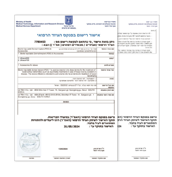 [사진=울트라브이 제공]‘울트라콜(UltraCol)’은 PDO(Polydioxanone) 성분을 분자 단위로 쪼갠 후 피부층 주입에 최적화된 미세구 형태로 가공하는 독창적 기술로 제작되었다. 콜라겐 재생과 볼륨감 형성에 탁월하며, 주름 개선과 탄력 증진, 피부결 개선에 도움을 준다.‘울트라콜(UltraCol)’은 시술 후 체내에서 가수분해되어 별도의 제거가 필요 없는 것이 장점이며, KFDA인증과 유럽CE 인증, 중국 하이난성 CFDA 인증을 보유하고 있다. 이 제품은 또한 독보적인 특허기술로 IR52 장영실상과 대한민국 특허대상을 수상한 바 있어, 그 기술력과 안전성을 인정 받고 있다.울트라브이 관계자는 “이스라엘 품목허가는 글로벌 성장에 중요한 이정표가 될 것이다”라며 “앞으로 이스라엘 현지 맞춤형 전략을 적극 수립해 글로벌 경쟁력을 강화하고 성장세를 지속하며, 글로벌 미용의료 산업을 선도해 나갈 것”이라고 말했다.한편, 울트라브이는 최근 몇 년 간 아시아 및 유럽 시장에서도 성과를 거두며, 글로벌 미용의료 시장에서의 입지를 확대해왔다. 앞으로도 새로운 시장에서의 기회를 모색하며 지속적인 혁신을 이어갈 예정이다.?