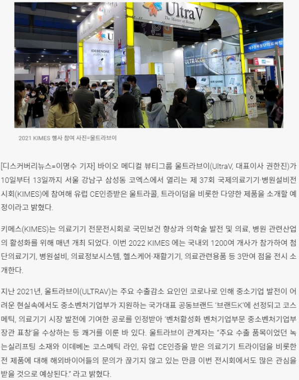 [뉴스] 울트라브이(UltraV), 국제의료기기&병원설비전시회 ‘키메스 2022’참가