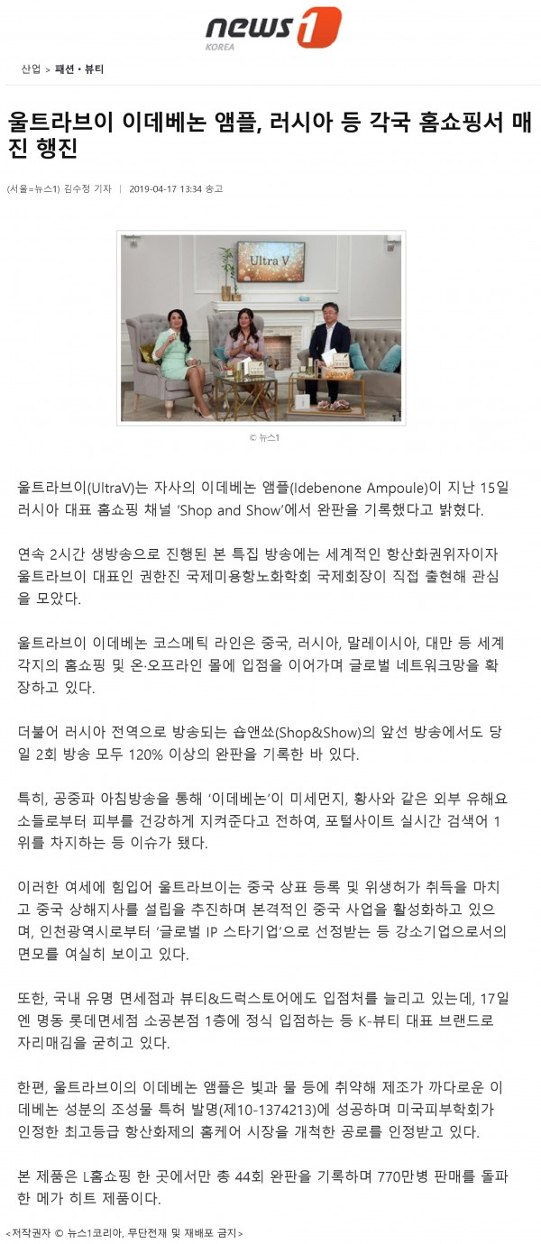 [뉴스] 울트라브이 이데베논 앰플, 러시아 등 각국 홈쇼핑서 매진 행진
