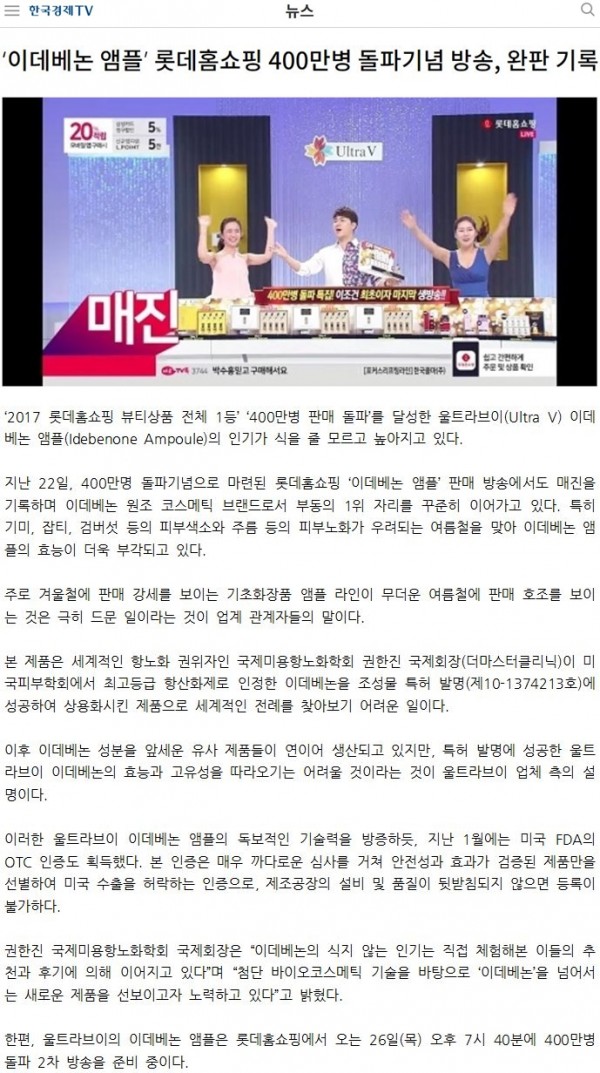 [뉴스]‘이데베논 앰플’ 롯데홈쇼핑 400만병 돌파기념 방송, 완판 기록