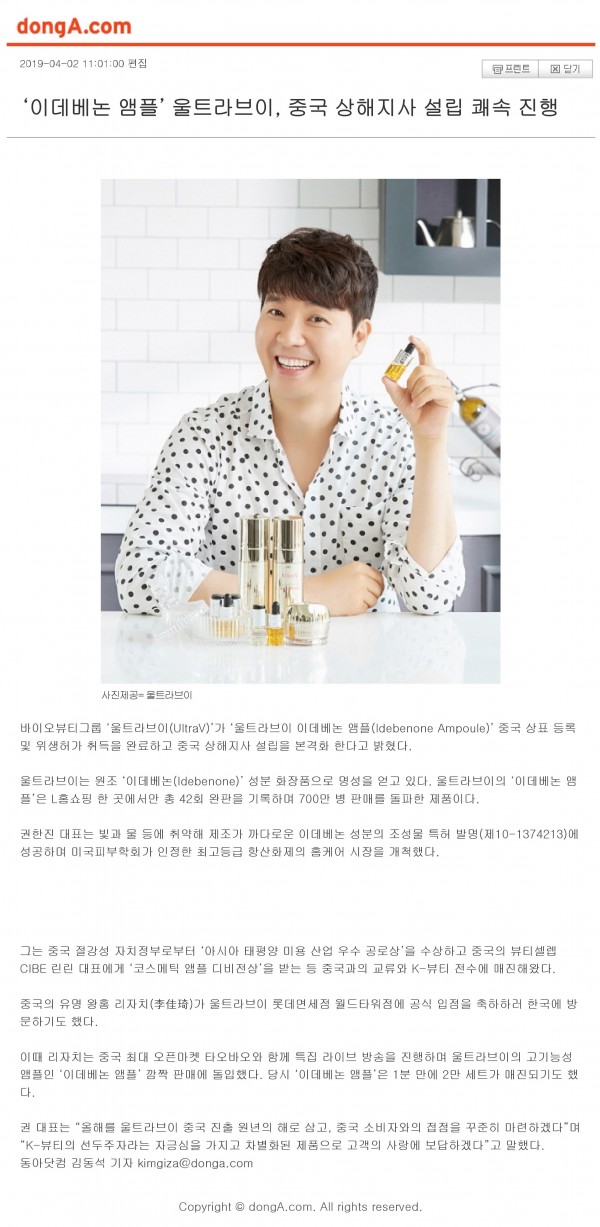 [뉴스] ‘이데베논 앰플’ 울트라브이, 중국 상해지사 설립 쾌속 진행