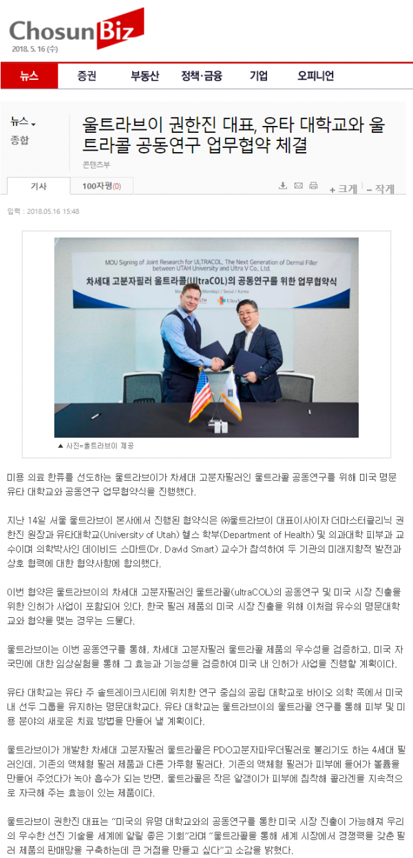 [뉴스] 울트라브이 권한진 대표, 유타 대학교와 울트라콜 공동연구 업무협약 체결