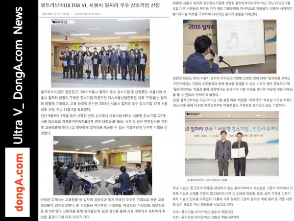 [동아일보]서울시 일자리 우수강소기업 선정-울트라브이