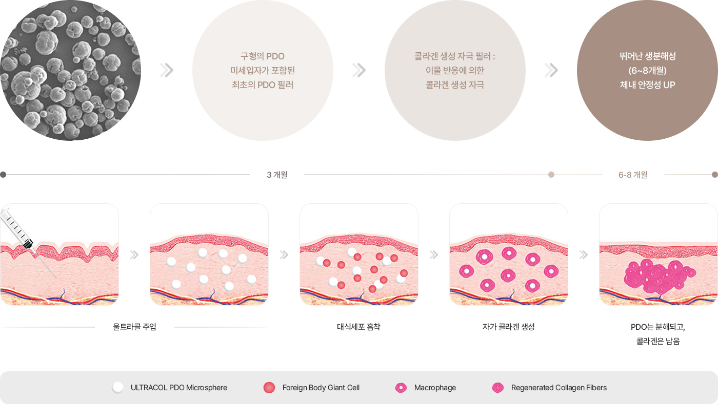 울트라콜(UltraCol)은 PDO 성분에 Unique Micronizing Technology를 적용하여 만든 세계 최초 & 세계 유일의 미세구 (Microsphere) PDO 콜라겐 생성 주사 (Collagen Stimulating) 입니다. 피부 내에 주입된 울트라콜 입자는 4~6개월 이내로 잔존물 없이 물과 이산화탄소로 완전 분해되어 자연 소멸됩니다.
